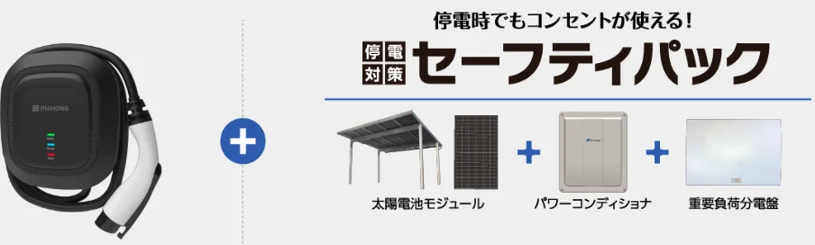 「EV充電器」+「セーフティパック」を組み合わせれば、通常時にEV普通充電器からEV車へ充電するだけなく、停電時にEV車内(または発電機)のACコンセントから重要負荷分電盤を介して自宅内の5系統、最大1.5kW分の電気を送電できます。太陽光発電システムと重要負荷分電盤のV2Hライクなシステムは導入コストを抑えつつ、停電時の電力供給を実現します。