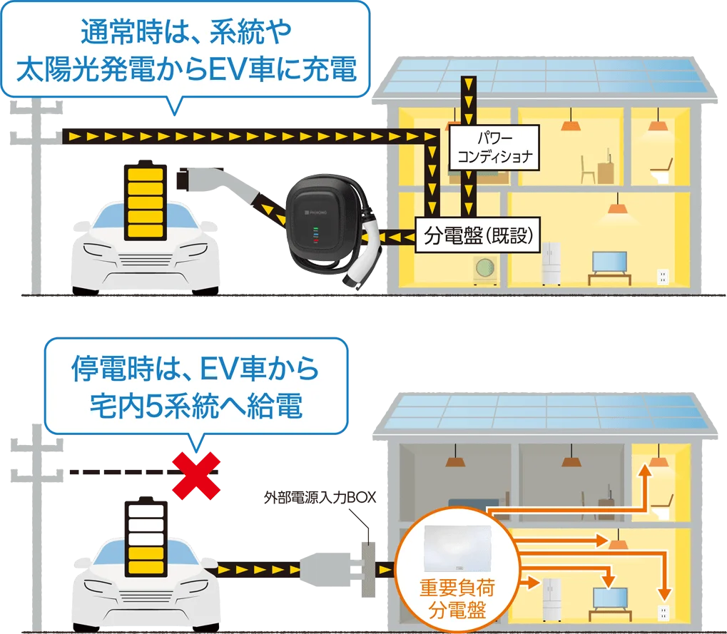 ※EV車に蓄えられた電力を、家庭用に有効活用する考え方のこと。(V=Vehicle 2=to H=Home)の「車から家へ」の略語
