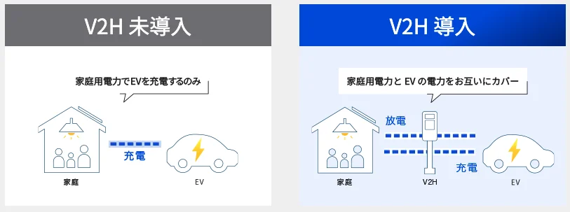 V2Hとは、電気自動車に搭載されたバッテリーの電力を家庭用電力として活用する仕組みです。
