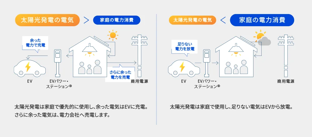 昼間、太陽光発電に余剰が出れば、EVに充電しておき、