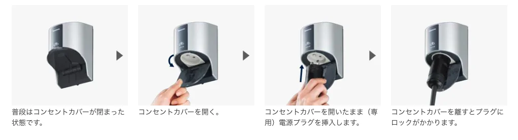 電気自動車の充電ケーブルに求められる抜け防止機能としてコンセントカバーと(専用)電源プラグの突起部が引っかかりロックされる構造です。電源プラグをコンセントに差し込むだけで簡単に接続でき、操作性に優れています。
